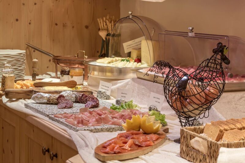 In the bathroom, you'll find a large whirlpool tub, and the view of the surrounding mountains is magnificent. A small but exquisite wellness area with a swimming pool, sauna, steam bath, and massages completes the offer.