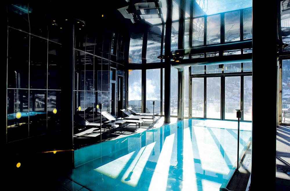 The Omnia Mountain Lodge is located in the center of Zermatt, perched 45 meters above the village on a rock. Guests reach the lift inside the rock through a tunnel, which floats them up to the lobby at 1,649.4 meters above sea level.