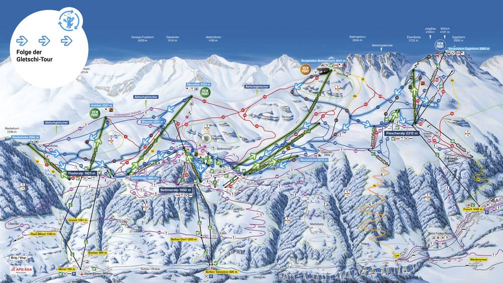 The Gletschi Tour is a winter sports tour through the Aletsch Arena for the whole family. You’re always on Gletschi’s trail as you ski the red and blue slopes. Fun, adventure and variety await you throughout the Gletschi Tour, which takes in all the highlights such as Family Fun Slopes, snow tubing, Skimovie and Co., etc.aletscharena.ch/gletschi-tour-en