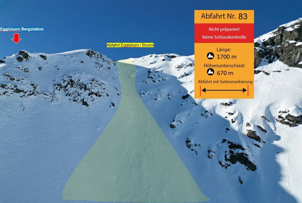 The "descent" starts at the View Point Eggishorn, behind the Horli-Hitta. The first 140 meters of this "descent" are very narrow and very steep. The entire route is 1,700 meters long and covers an altitude difference of 670 meters. The "descent" in the Eggishorn/Brunni area ends at the Heimatt chairlift. A "descent" is not groomed and there is no final inspection, but it is secured against alpine hazards. The "descent" is only suitable for very advanced skiers.2023/2024