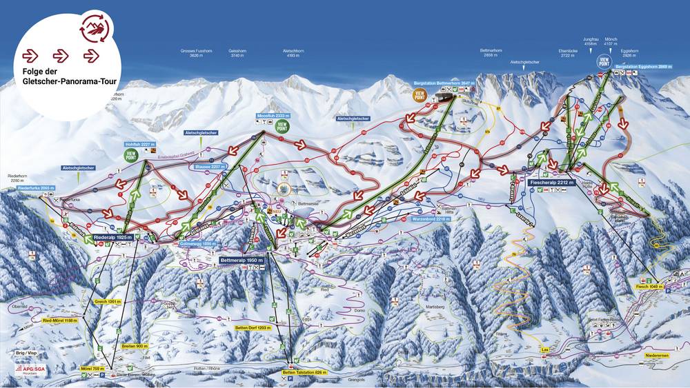 The mountain railways in the Aletsch Arena (Riederalp, Bettmeralp, Fiesch-Eggishorn) offer the new Aletsch + viewpoint pass from winter 2014/2015.Travel in comfort by mountain railway to the 3 viewpoints of the Aletsch Arena (Moosfluh, Bettmerhorn or Eggishorn). The Great Aletsch Glacier is just a stone's throw away from here.