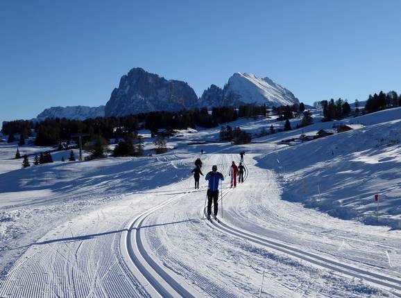 Snow-sure high-altitude cross-country trails traverse the Seiser Alm, offering magnificent views of the Dolomites. Whether easy, intermediate, or difficult, skating or classic style, everything is available on the high plateau. Cross-country ski tickets must be purchased.