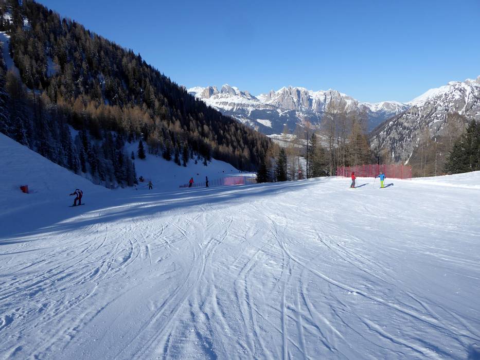 Wide valley runs lead to the Ronchi and Castelir base stations. A valley run (connecting trail) leads all the way down to Moena (without lift connection).
