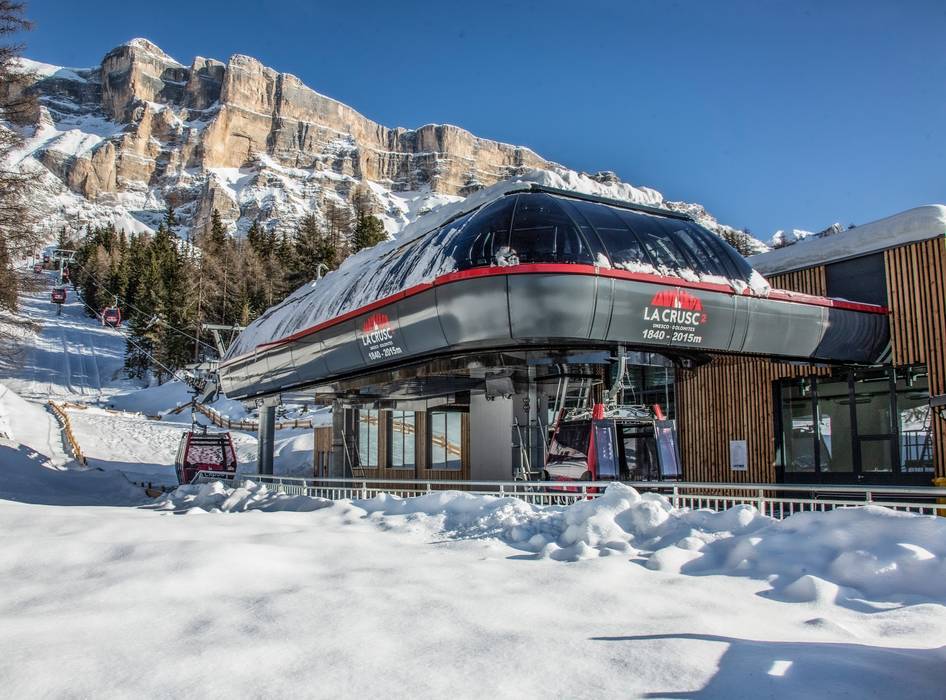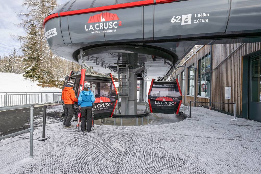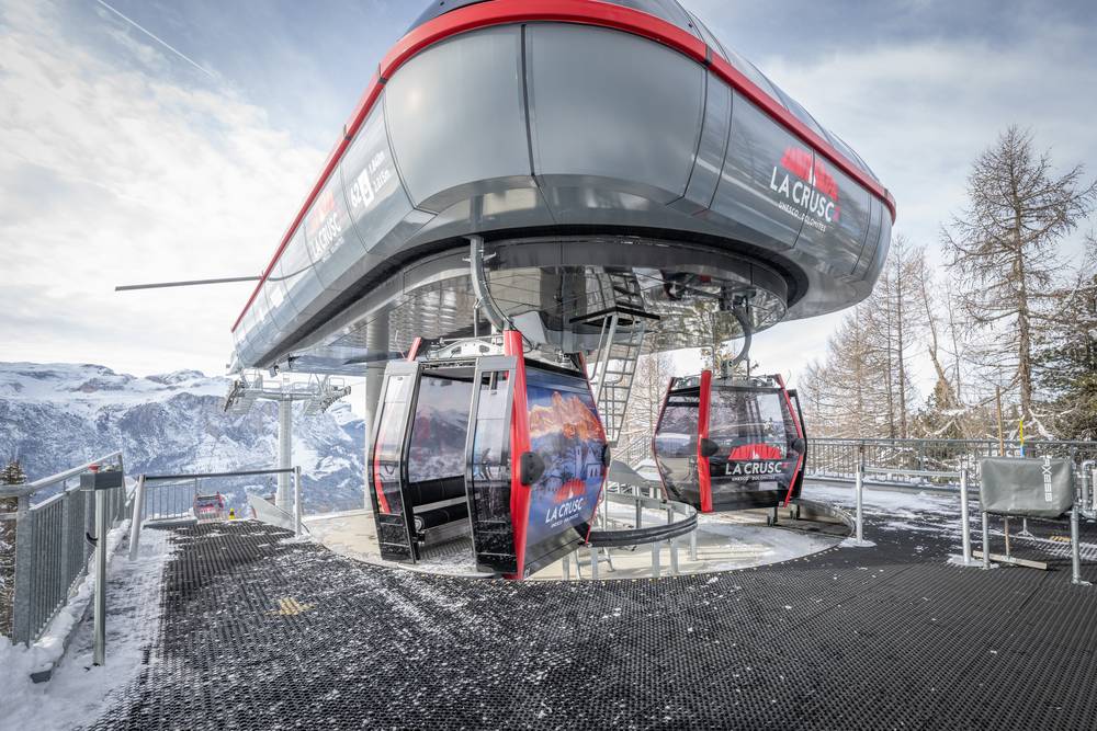 The new 10-seater gondola lift La Crusc replaces the 2-seater chairlift La Crusc. This state-of-the-art lift system brings a new level of quality to the route leading to the well-known La Crusc/Santa Croce church in the Badia district. The ride now takes less than half the time compared to its predecessor, while passengers are protected from cold, wind, and weather.
