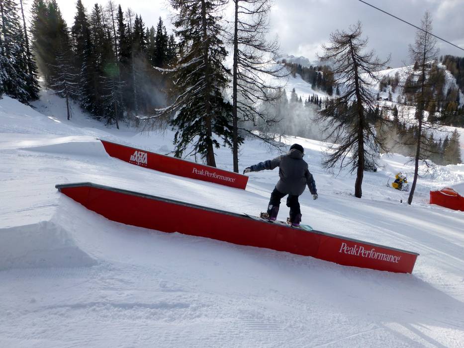 The Snowpark Alta Badia is located on the Piz Sorega plateau at the Ciampai six-seater chairlift and offers great jumps, boxes, and rails.