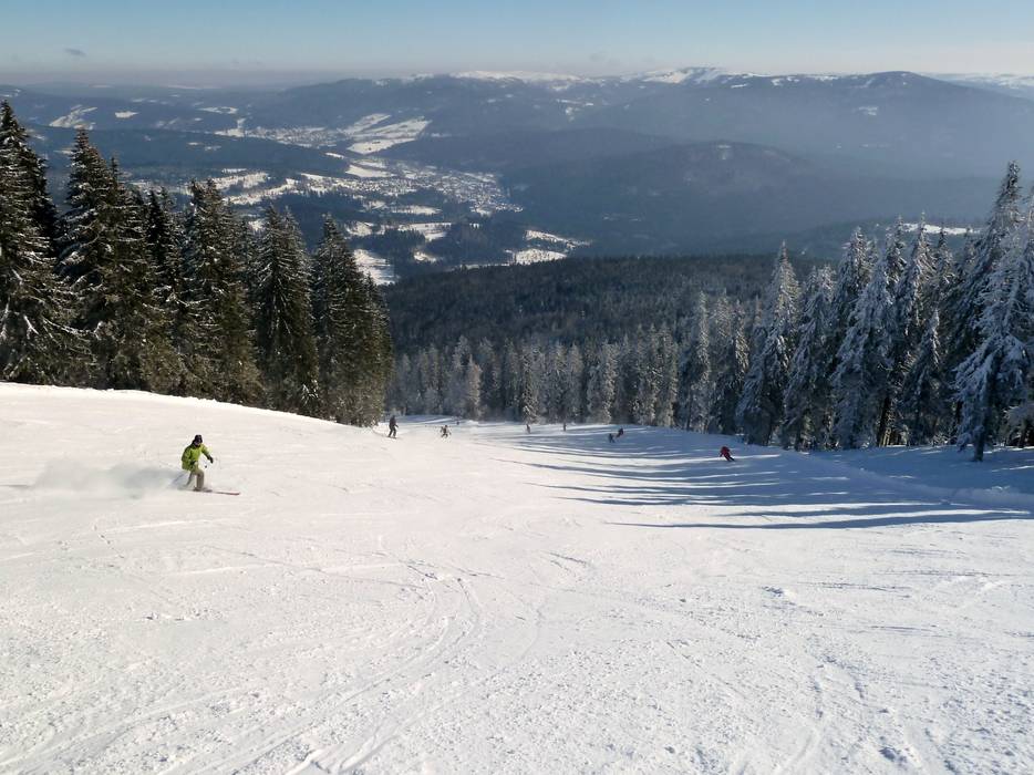The ski route starts directly at the summit of the Arber and leads to the village of Bodenmais. The trail is usually groomed with a snowcat track. There is no ski lift connection back to the Arber in Bodenmais.