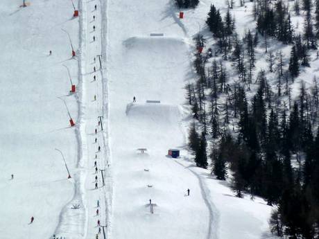 The snow park in Carinthia is about 600 meters long and is located at the Spitzeckbahn. At around 1,760 meters above sea level, there are not only jumps but also rails, boxes, and banked turns.