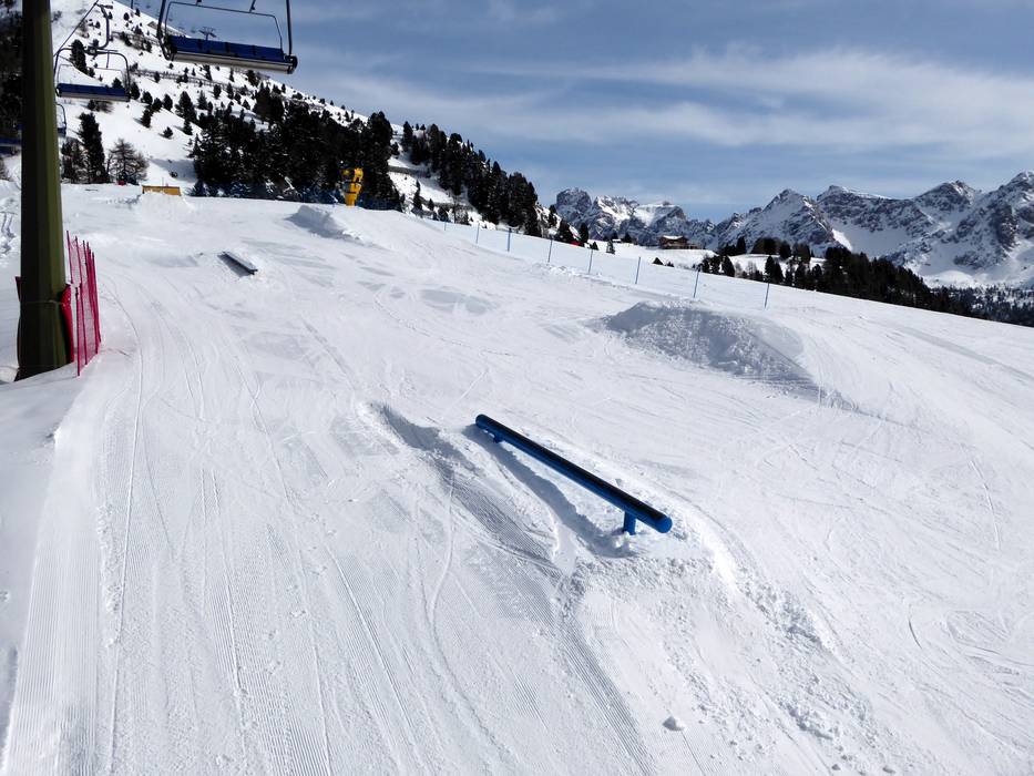 The snowpark is located just below the Buffaure mountain station. Boxes, rails, and jumps await freeriders. A tank completes the range of features.