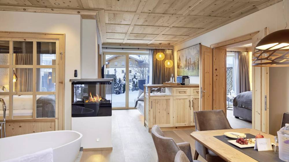 At Singer's SPA, located on the other side of the street and directly connected to the hotel by a passageway, you can truly relax. A beautiful indoor pool with access to the year-round heated outdoor pool forms the heart of Singer's SPA. Here, you can let the water jets massage you. Sauna, steam bath, wellness bar, massage rooms, and a relaxation room with an open fireplace complete the offer. An oasis in the Tyrolean Zugspitz Arena.