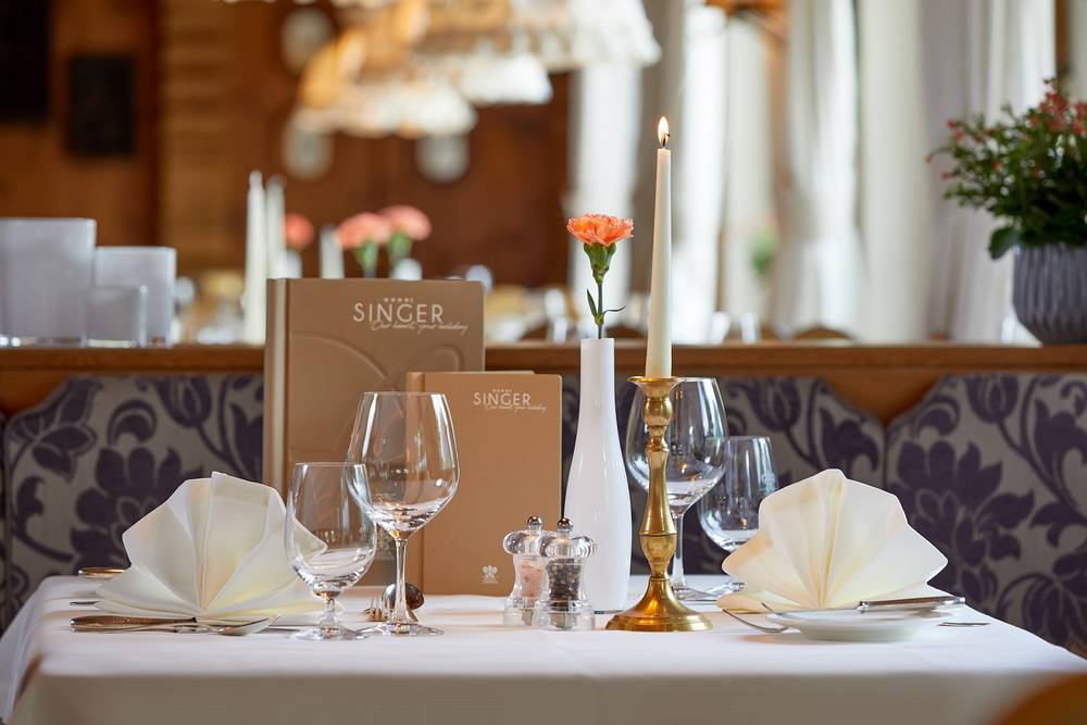 Guests are thoroughly pampered with Singer's indulgent half-board. The extensive breakfast buffet tempts with seasonal and regional products. The five-course gourmet dinner menu with a daily salad and cheese buffet leaves nothing to be desired. The professional service welcomes guests by name and anticipates every wish. In the SPA bistro (bathrobe zone) and the S-Lounge, you can enjoy snacks and drinks throughout the day.