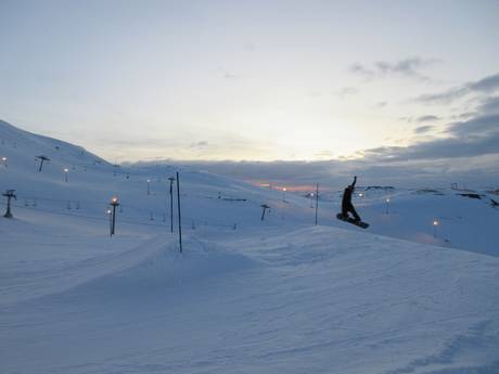 The Snowpark Bláfjöll is located next to the easy slope Kóngsgil and can be easily reached by the four-seater chairlift Kóngurinn or the double chairlift Drottningin. Various obstacles and a wave track await freestylers.