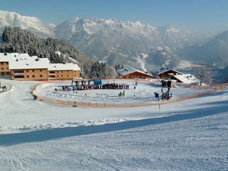 The children's area is located right next to the mountain station of the Dorfbahn and is well equipped with two conveyor belts.