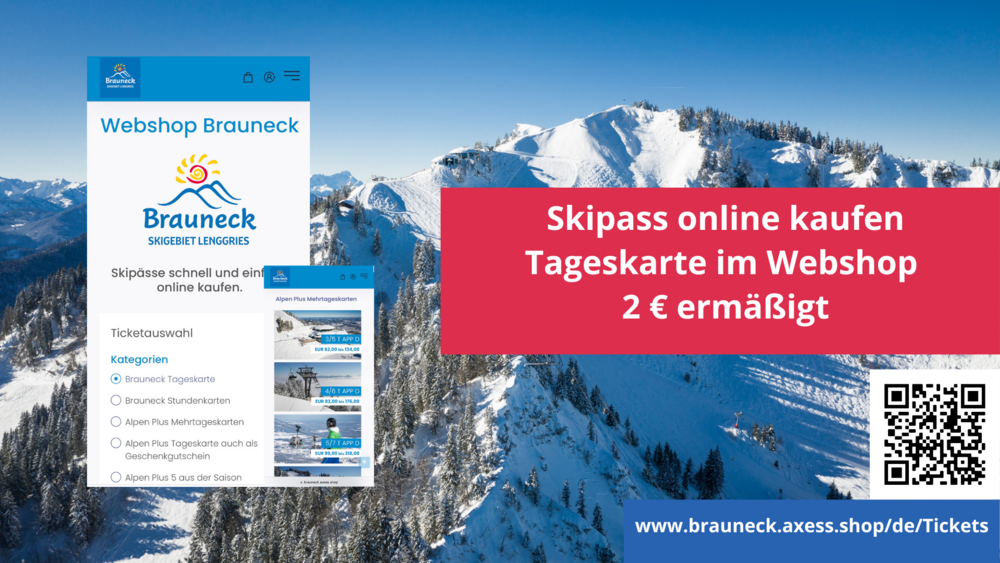 In the webshop, you can top up an existing Alpen Plus chip card or purchase a voucher that can be redeemed for a ski pass at the ski resort ticket offices or at the ticket machines in the ski area. Ticket machines are located at the valley stations of the Brauneck-Bergbahn.brauneck.axess.shop/de/Tickets