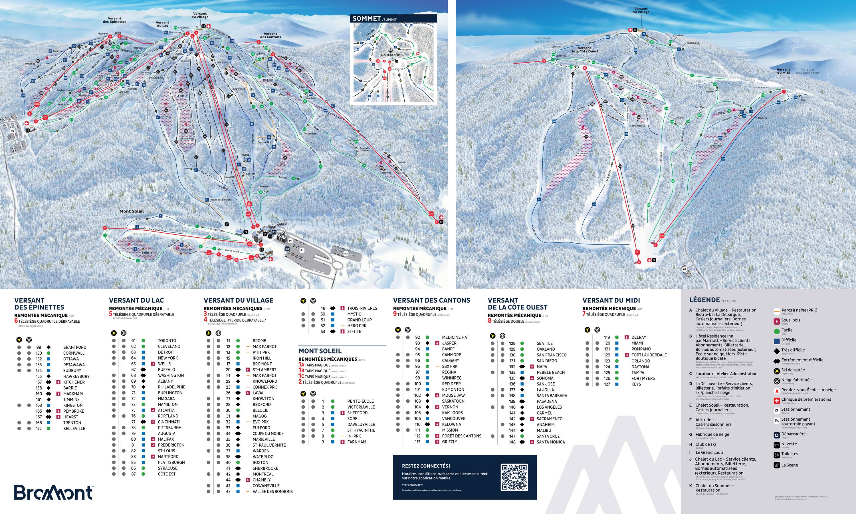 The trail map is divided into two sides and provides an excellent overview of the Bromont ski area. All lifts and slopes are marked and well described. All dining options, parking lots, and the individual snow parks are also indicated.