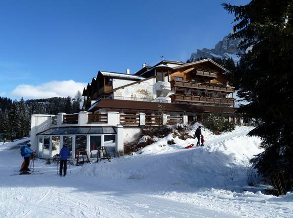 Accommodation options can be found directly on the slopes, such as Hotel Moseralm, Hotel Alpenrose, Casel Latemar, Hotel Rosengarten, Hotel Seehauser, or the Frommeralm. The towns of Welschnofen and Karerpass are located right next to the ski area. From St. Zyprian in the municipality of Tiers, the new Tierser Cabrio cable car leads to the ski area, although there are no slopes down to St. Zyprian. Directly at the valley station, you'll find the 5-star Hotel Cyprianerhof Dolomit Resort.