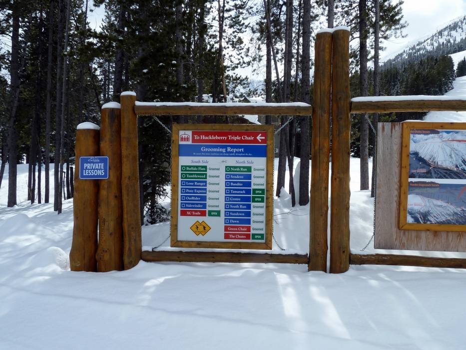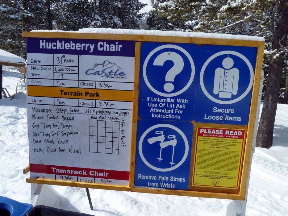 The trail map provides an excellent overview of the entire Castle Mountain ski area. All lifts, slopes, restaurants, and accommodation options are marked. Each run is labeled with its name. Additional details such as elevation information and lift details can also be found on the trail map.