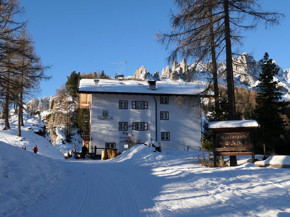 The family-run hut offers a magnificent view of the Dolomites. Here you can enjoy a delicious break on the sun terrace or warm up in the lounge next to the wood stove.