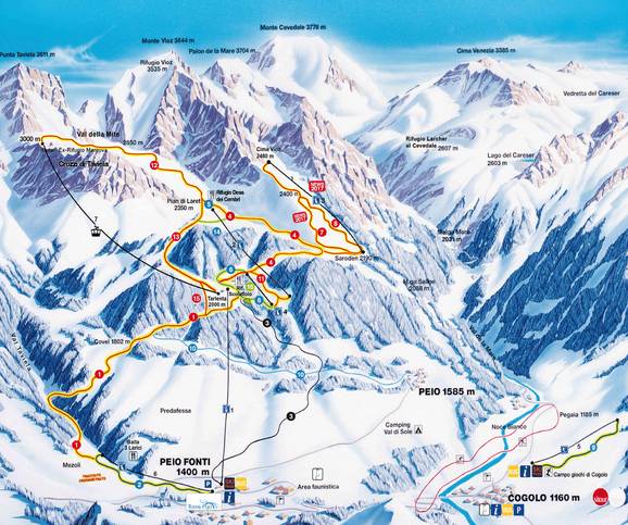 Cogolo (0.7 km), Peio Fonti (4 km), Peio (6 km) Towns/villages at the ski resort