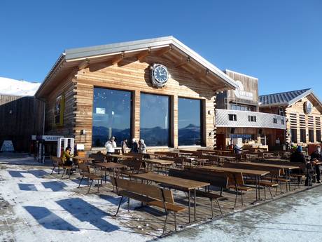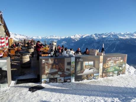 Throughout the entire Crans-Montana ski area, restaurants and ski lodges are spread out. The selection ranges from exclusive to simple restaurants and ski lodges offering Valaisan specialties. The panoramic view from the sun terraces over the Rhone Valley is fantastic.