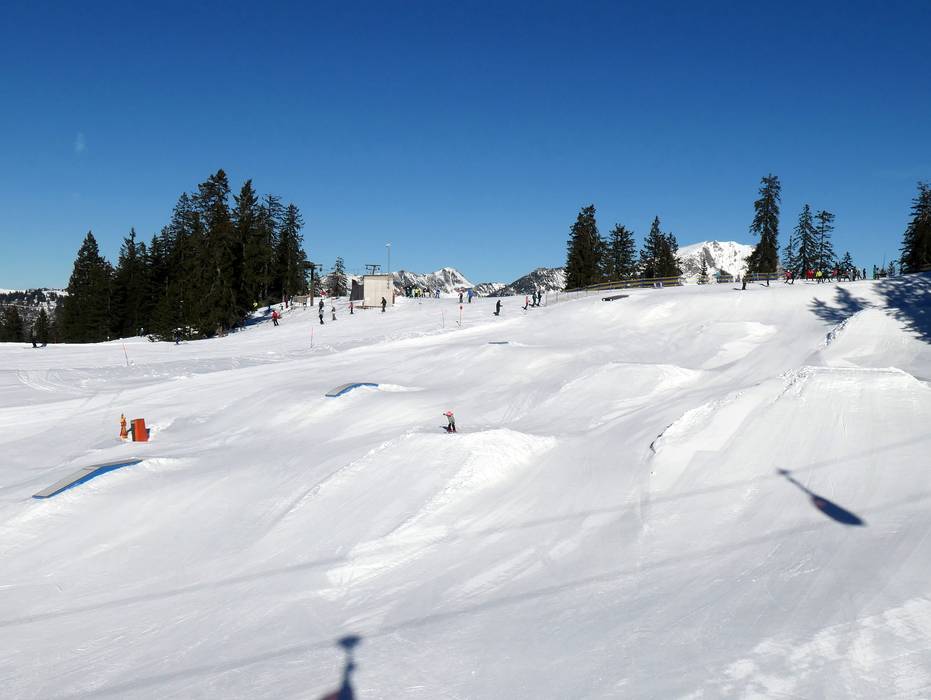 The snow park is fun for the whole family. In a sunny location, the obstacles and jumps are designed for families.