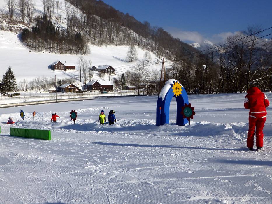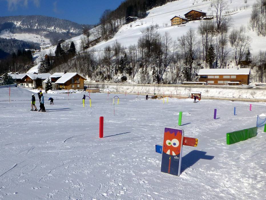 Near the valley station of the Sunneggbahn, there is a large practice area with conveyor belts. One of them is covered. There is plenty of space here and fun figures for the little ones.