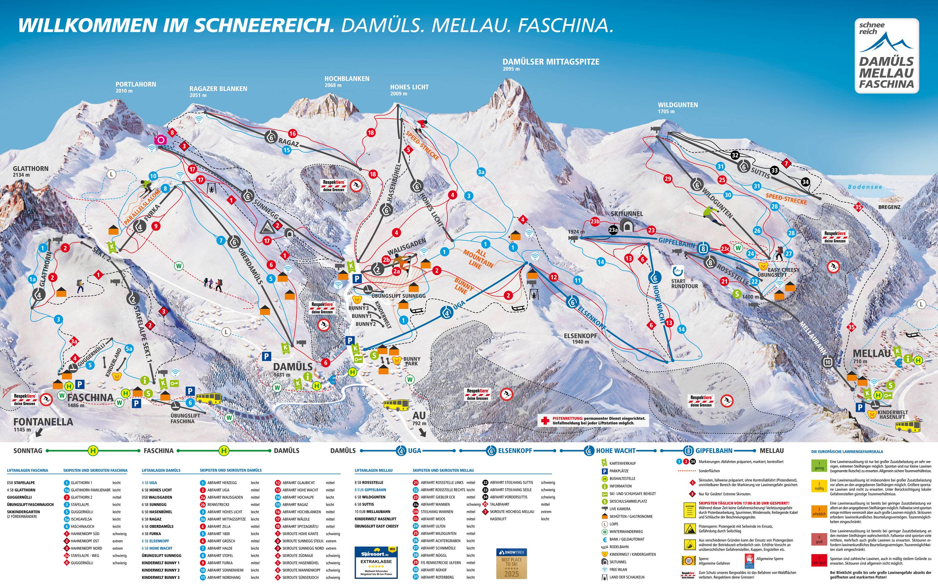 The trail map of Damüls Mellau is clear and easy to understand. Every slope and lift is labeled with its name. On the back, you can find the timetables for the ski buses and contact details for the mountain restaurants. However, the lift symbols and descriptions could be made even clearer.