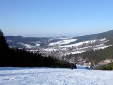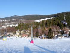 Skicentrum Deštné v Orlických horách is one of the larger ski resorts in the Orlické hory (Eagle Mountains) and, in addition to two fast chairlifts, offers several drag lifts and conveyor belts for skiers and snowboarders. The winter sports area features snow-covered slopes of all difficulty levels, complemented by practice slopes, children's areas with a ski school, and a small snow park. Night skiing on the illuminated slopes is especially popular.