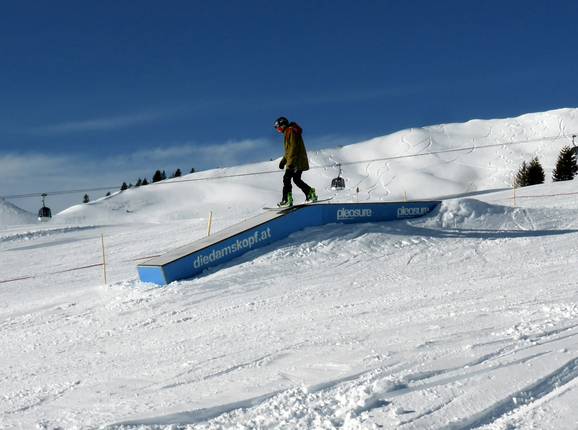 The fun park at Diedamskopf offers obstacles for everyone, from freestyle beginners to aspiring pro riders. In addition to the main park, there is also a line in the upper area of the ski resort with obstacles such as the Jibkugel and Butterbox.