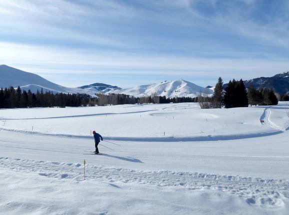There are no cross-country trails directly at the Dollar Mountain ski area. However, Sun Valley offers a fantastic selection of cross-country trails. About 2 km from the ski area, you'll find 40 km of exclusive trails at the Sun Valley Nordic Center. The trails are groomed daily for both classic and skating styles. The Sun Valley Club offers a luxurious atmosphere. Various routes of all difficulty levels are available. In the nearby Blaine County Recreation District (BCRD), you'll find another 160 km of trails in the Sawtooth National Recreation Area. Here, you can often enjoy complete solitude in nature.