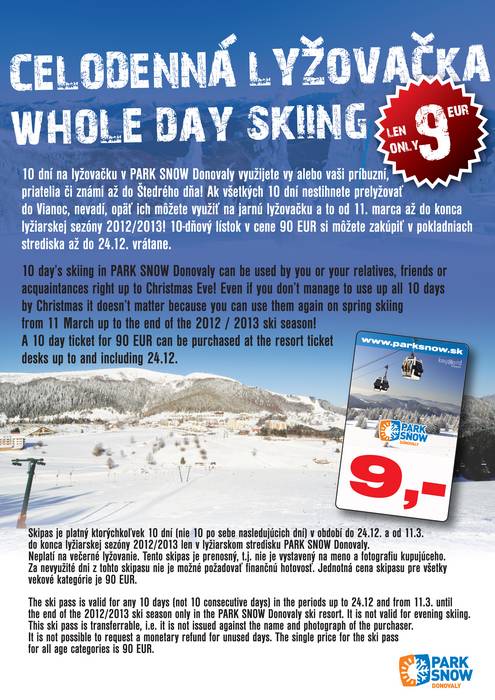 10 day’s skiing in PARK SNOW Donovaly can be used by you or your relatives, friends or acquaintances right up to Christmas Eve! Even if you don’t manage to use up all 10 days by Christmas it doesn’t matter because you can use them again on spring skiing from 11 March up to the end of the 2012 / 2013 ski season!A 10 day ticket for 90 € can be purchased at the resort ticket desks up to and including 24.12.The ski pass is valid for any 10 days (not 10 consecutive days) in the periods up to 24.12011/2012