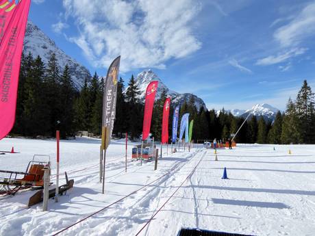 The children's ski kindergarten of the Skischule Ehrwald Total is located next to the mountain station of the gondola and features several magic carpets and a mini lift. Here, little ones can learn winter sports at their own pace.