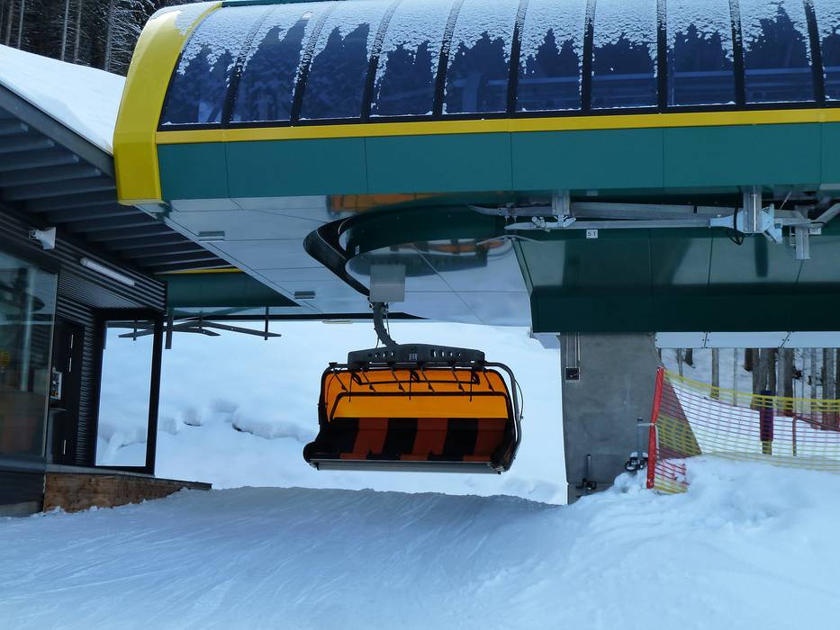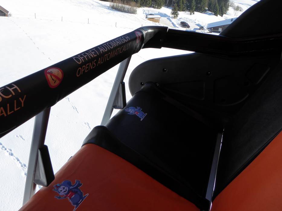 The 6-seater chairlift Sonnenhang Sunracer is equipped with child safety features and orange weather protection covers.