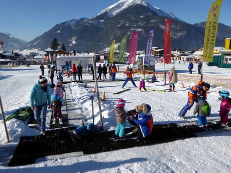 The clearly laid-out Wettersteinbahnen Ehrwald ski area is very well suited for families. The area at Sonnenhang is ideal. In addition to the children's areas of the ski schools, there is a practice area with a magic carpet and a drag lift. The 6-seater Sonnenhang Sunracer chairlift is equipped with child safety features, and the slopes are wide and easy. There is also a cool wooden bridge course, the fun Pony-Lernpiste, a kids' halfpipe, and the Kidspark. Advanced children can improve their skiing skills at the Wettersteinbahn and the Gamskarlift.