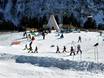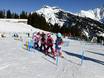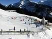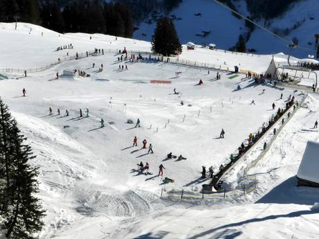 Near the mountain station of the gondola lift, next to the mountain restaurant Ämpächli, the Children's Arena is located in a sunny spot. On three slopes with varying terrain gradients, children can learn snow sports in a relaxed and playful way using attractive teaching aids. The different terrain gradients allow for optimal learning progress. The Children's Arena is accessible to all parents with their children and is also used by both ski schools. There are special arena tickets available.