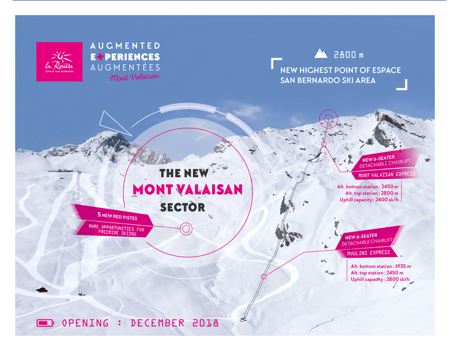 New Mont Valaisan Sector : 5 new Red Slopes, with more opportunities for freeride skiing and 2 new chairlift 6 seater.New Highest point of Espace San Bernardo Ski Area : 2 800 m .