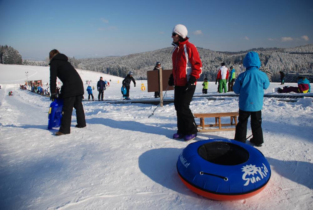At the conveyor belt with the gently sloping practice area, families can practice perfectly. This is also a great spot for kids and the young at heart who can't or don't want to ski. A conveyor belt takes you to tubing runs or a toboggan slope. Rental is available for toboggans and tubing equipment.