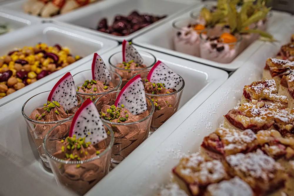 In the morning, guests can enjoy a rich breakfast buffet with Thuringian specialties and popular breakfast classics. During the day, the coffee bar offers complimentary specialty coffees. In the evening, guests are treated to a variety of menus, complemented by an appetizer and dessert buffet.