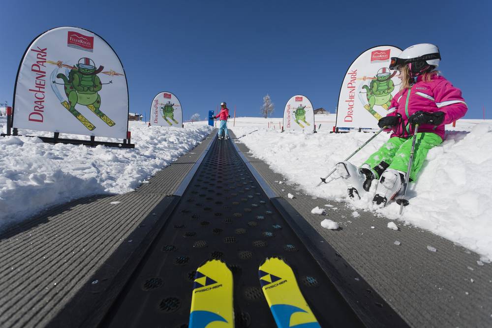 Whether little ski rookies or beginner skiers, in the extended kinderpark area of the 'Drachenpark', everyone becomes an enthusiastic skier. The new tow-lift with 55m and the two conveyor belts with 9m and 24m as well as the additional new slopes are perfect to learn the first turns.2017/2018