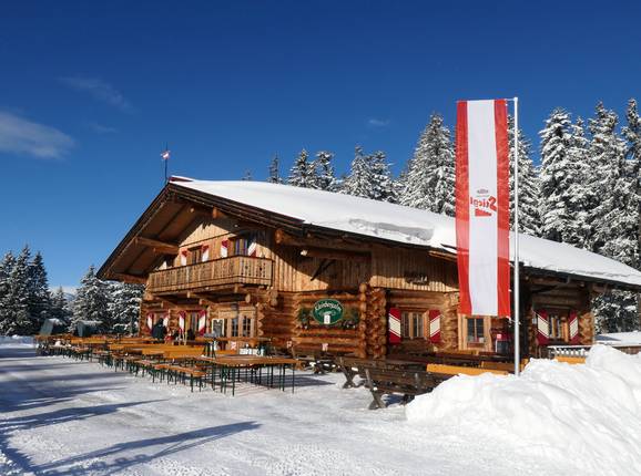 The Kleinbergalm, built in the style of a massive log cabin, spoils guests with delicious homemade specialties in the cozy lounge and on the sunny panoramic terrace. A toboggan run also starts here.