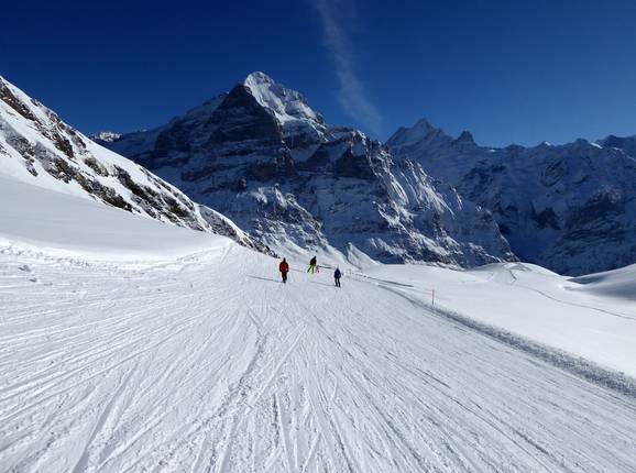 Beginners can ski in the upper area of the resort on easy slopes. From the highest point at Oberjoch at 2,500 m, you can ski down via Schreckfeld to Hohwald on easy and wide slopes. At Oberjoch, there is even a Slow Slope for skiing at a leisurely pace. First attempts can be made in the bodmiARENA on the magic carpet and the platter lift. The bodmiARENA is located slightly above Grindelwald and is easily accessible by ski bus. The valley runs are rather intermediate, so beginners should take the gondola down to the valley.