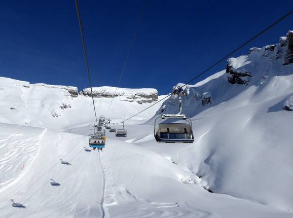 From Grindelwald, you can comfortably reach First at 2168 m without changing lifts, using a six-person gondola in three sections. Within the ski area itself, fast four-seater chairlifts provide access to almost all slopes. In addition, there are two drag lifts at the top of the ski area and two platter lifts in the valley area at the Bodmi practice area. A conveyor belt is available for beginners.