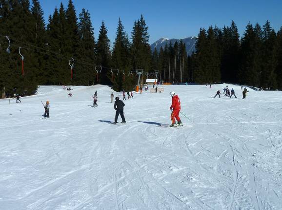 In the Garmisch-Classic ski area, beginners are in very good hands around the Hausberg at the Kreuzwankl-Express and the Rimmlermoos lifts. Additionally, there is a covered conveyor belt here. This is an ideal place to prepare for future challenges. The valley runs and the area at Osterfelderkopf are not suitable for absolute beginners.