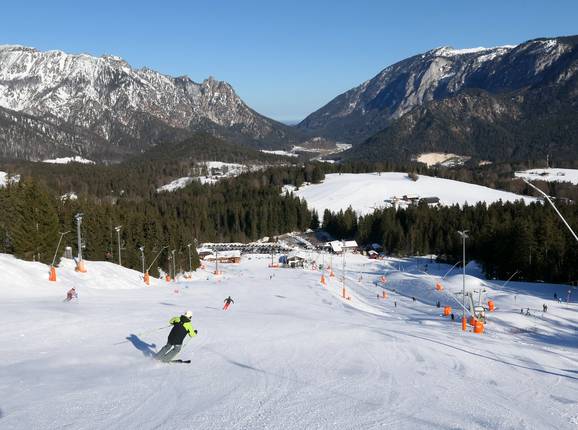 The Götschen ski area is located above Bischofswiesen in the Berchtesgadener Land region. The slopes for skiing and snowboarding are served by the Götschenkopfbahn and drag lifts. There is also a valley run towards Bischofswiesen, but without lift access back to the ski area. Snowmaking machines