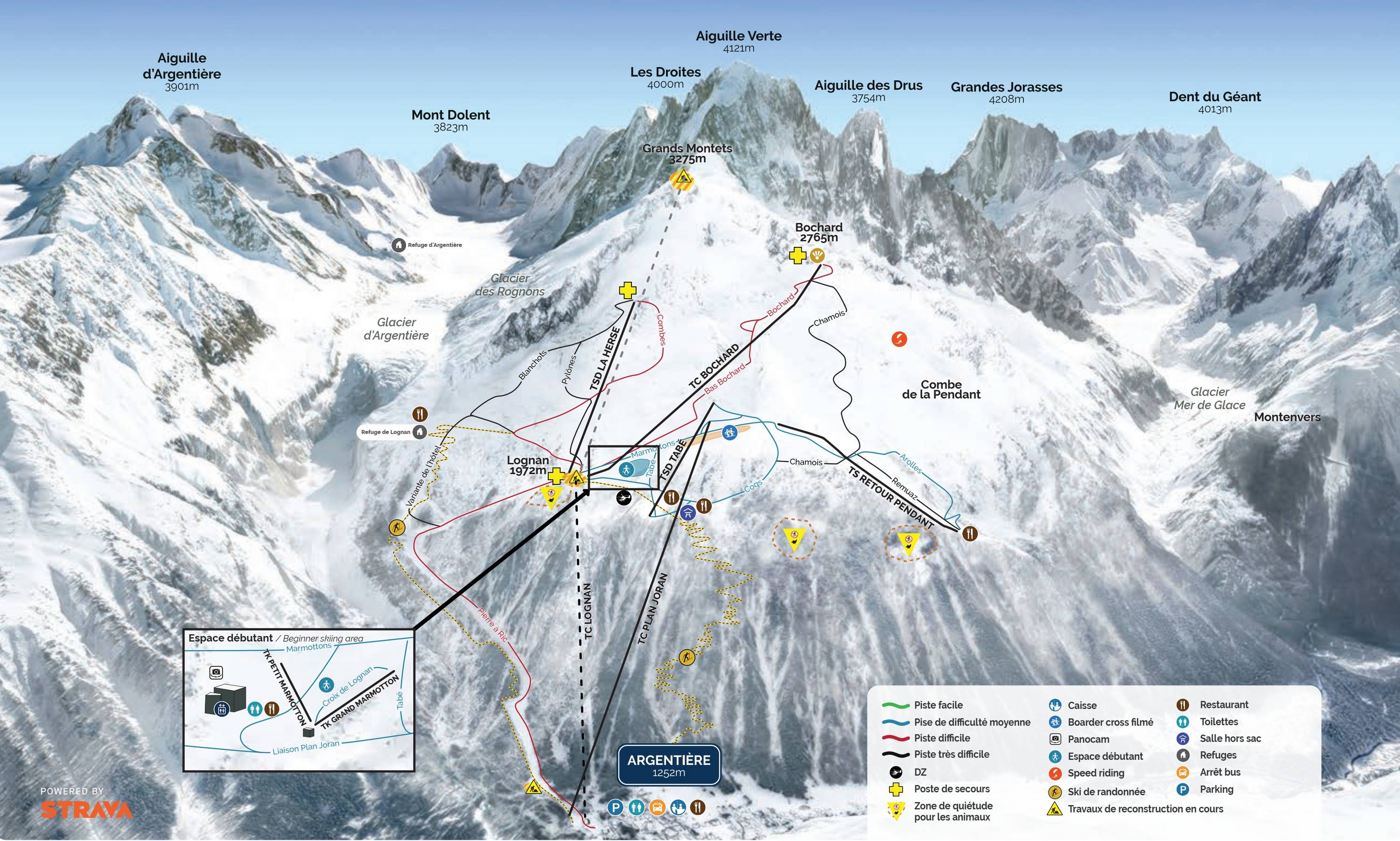 The piste map of the Les Grands Montets ski area is combined with all the other ski areas of Chamonix in a small brochure. There you will find further information for each of the ski areas. The only drawback is that the piste maps are printed quite small.