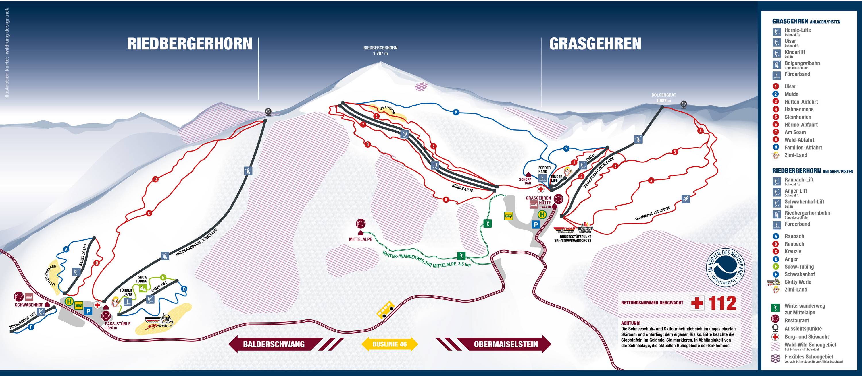 The slope map provides an excellent representation of the Grasgehren ski area. All slopes, lifts, and additional information are clearly marked. In the complete slope map of the Hörnderdörfer, Grasgehren can also be found in the Hörner Schnee(S)pass.