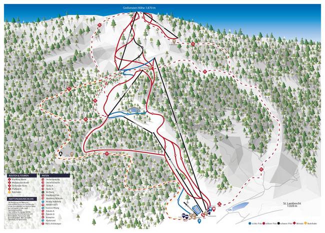 The new 10-seater gondola lift Greben10 connects St. Lambrecht with the Grebenzenhaus. The modern lift system covers around 650 meters of elevation and 2.8 km in well under ten minutes. In addition to offering a comfortable ascent for families, groups, and other guests with special needs, the 10-seater gondola lift Greben10 also provides the option of a safe descent for guests who have already exerted themselves enough on the mountain.