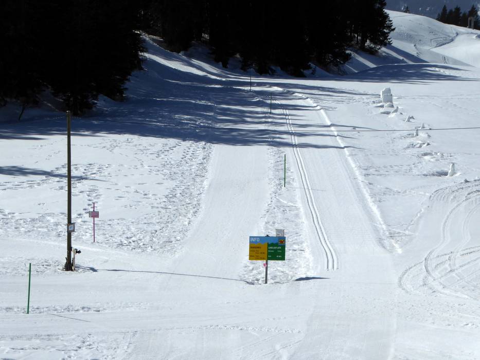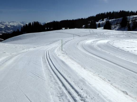 The cross-country ski trails (classic and skating) are located directly below the Berghaus Schwänzelegg on the Danusa high plateau at around 1,800 meters above sea level. Access is easy with the 8-seater gondola from the valley. From the trails, you can enjoy a magnificent 360-degree panoramic view of the surrounding mountains.