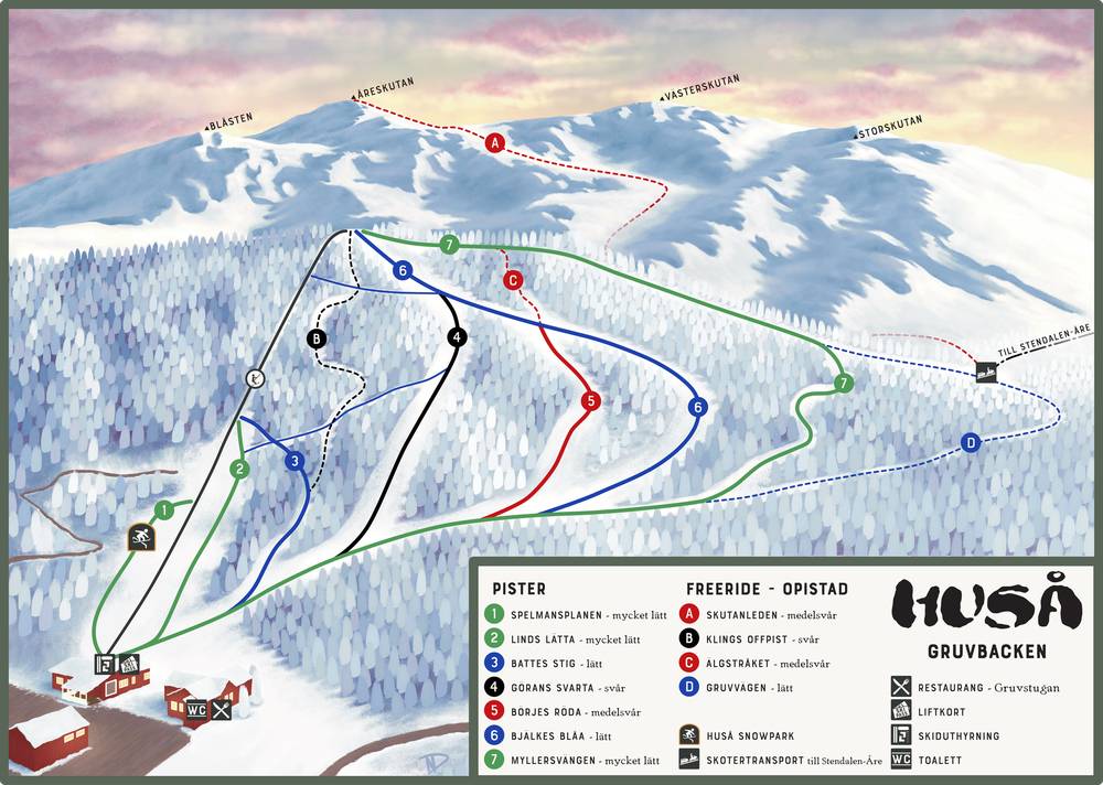 Huså (0.6 km), Åre (28 km), Järpen (26 km) Towns/villages at the ski resort