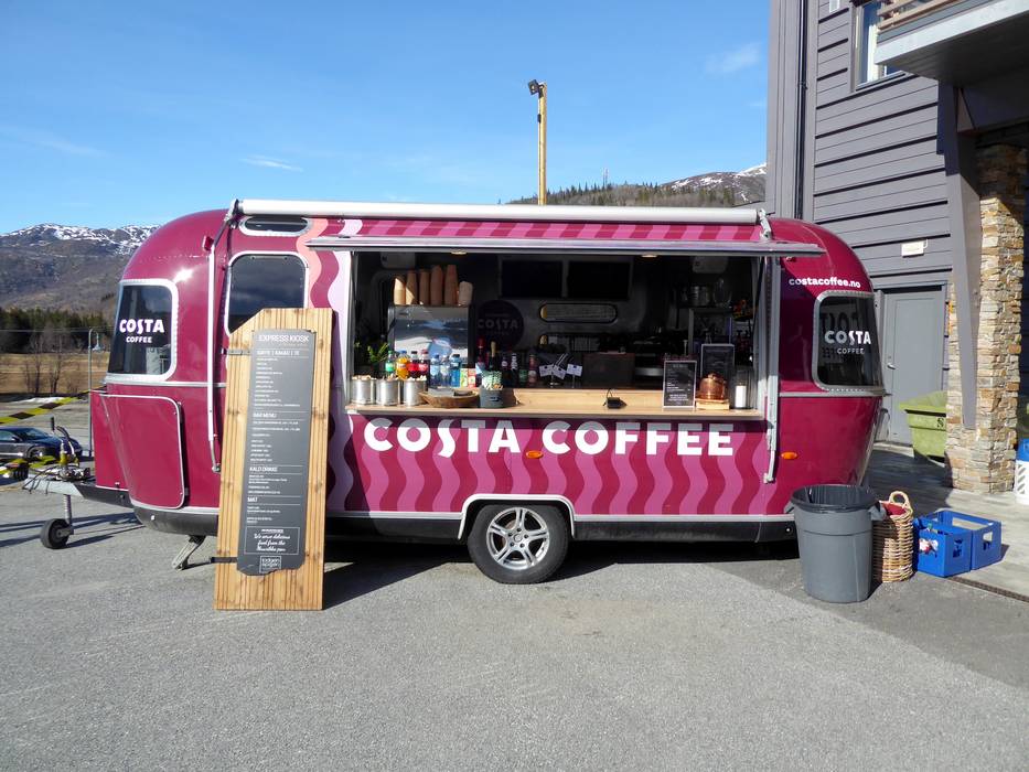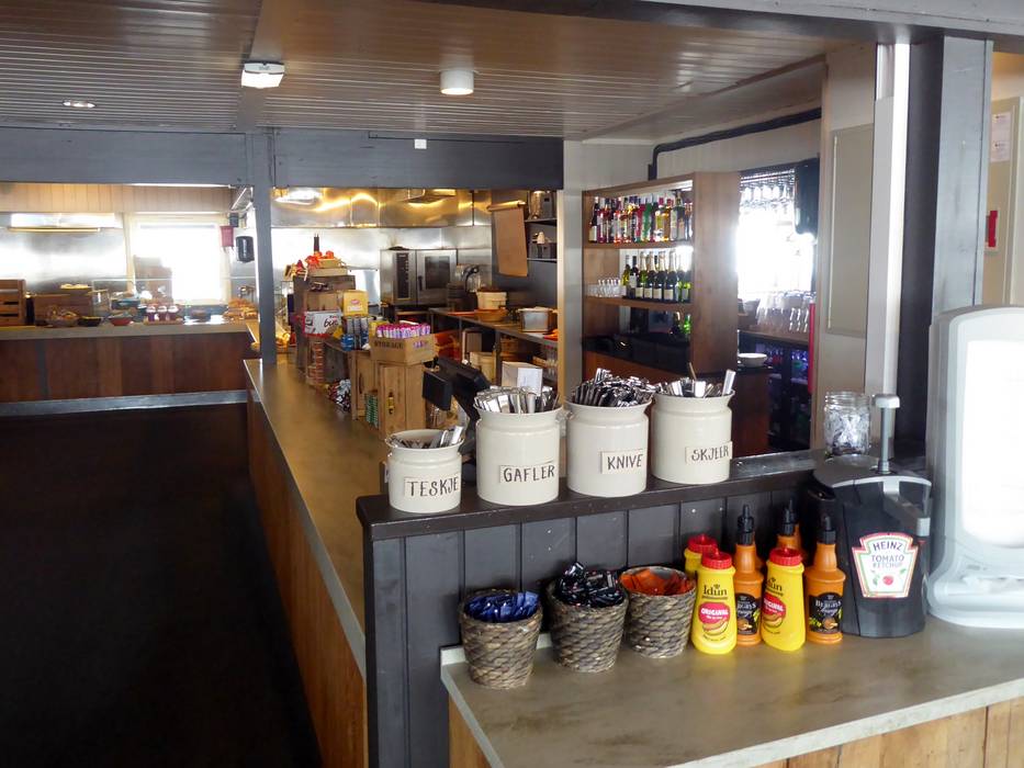 The café is designed in a traditional Norwegian style—warm and inviting with rustic wooden furniture. In good weather, you can enjoy the stunning mountain views from the sun terrace.