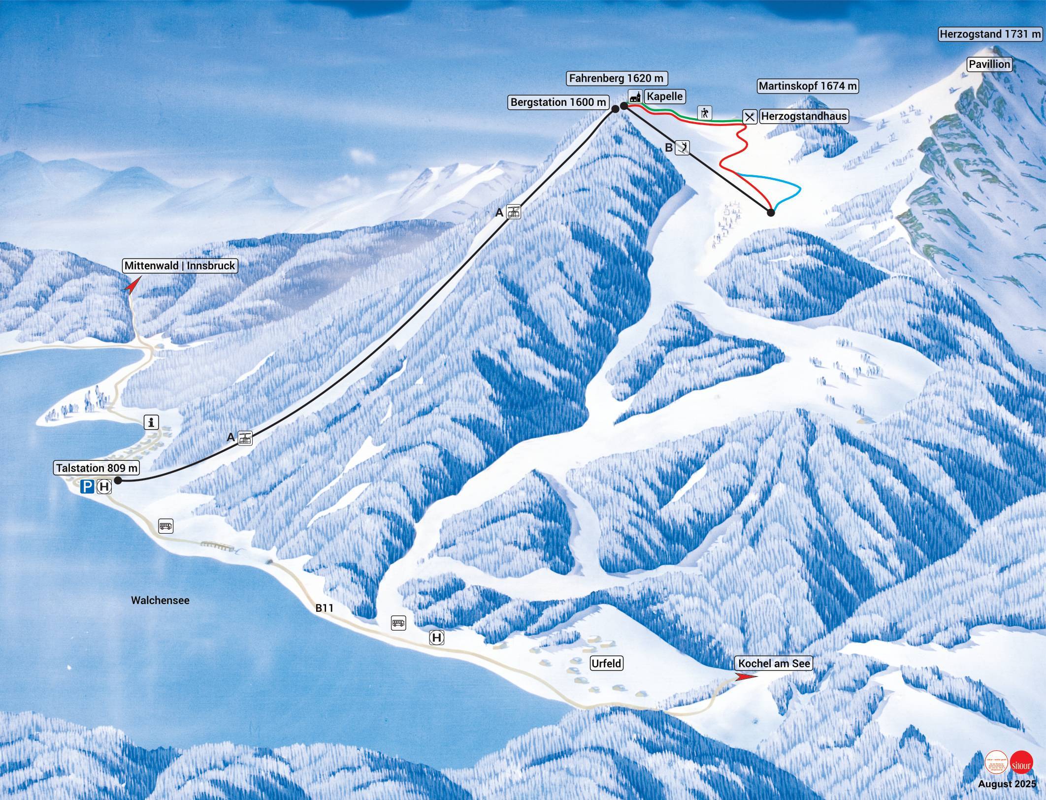 Walchensee (1.3 km), Urfeld (4 km), Kochel am See (13 km) Towns/villages at the ski resort